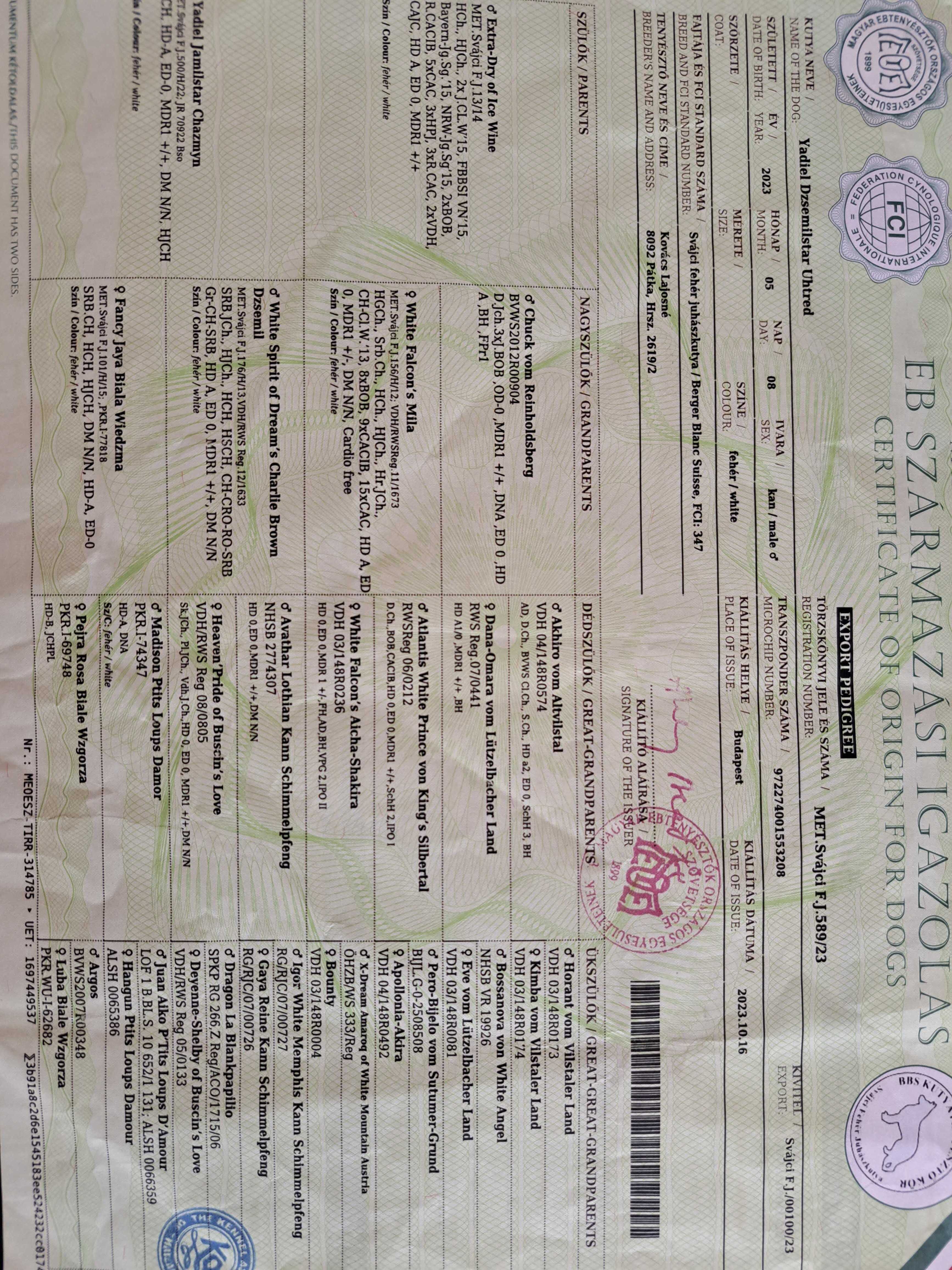 ยาเดล จามิลสตาร์ แชซมิน MET.สแวจซี FJ.500/H/22; เจอาร์ 70922 บซ CH, HD-A, ED-0, MDR1 +/+, DM N/N, HJCH สี / สี: fehér / สีฟ้า | ♂ชาร์ลี บราวน์ จาก White Spirit of Dream ดเซมิล MET.สวัจซี FJ.176/H/13; VDH/RWS Reg.12/1633 SRB,JCh., HJCh., HCH, HSCH, CH-CRO-RO-SRB Gr-CH-SRB, HD A, ED 0, MDR1 +/+, DM N/N สี / สี: fehér / สีฟ้า | ♂ อวาธาร์ โลเธียน คันน์ ชิมเมลป์เฟิง สปสช. 2774307 HD 0, ED 0, MDR1 +/+, DM ไม่มี/ไม่มี | ♂ อิกอร์ ไวท์ เมมฟิส คานน์ ชิมเมลป์เฟิง RG/RJC/07/00727 |